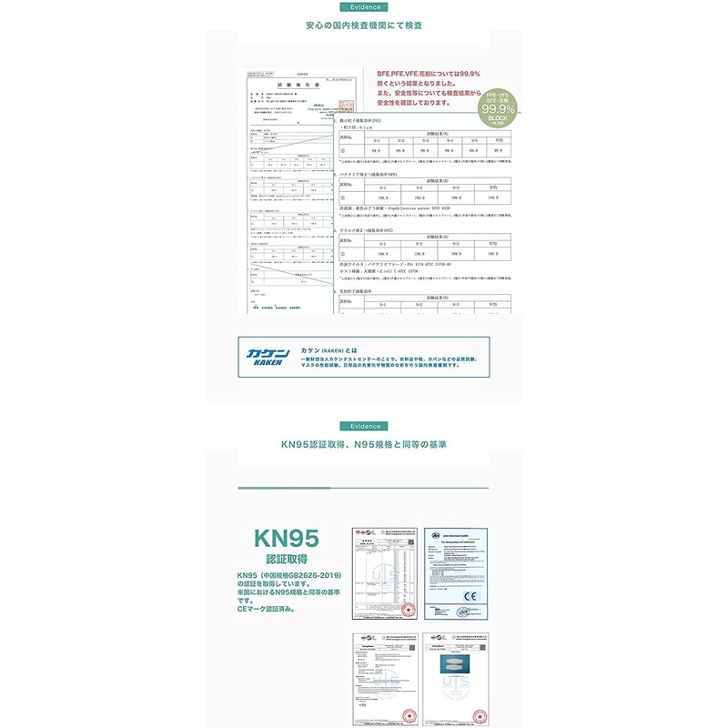 • Kaken Tested: The high-density 4-layer filter design has passed filtration efficiency testing of BFE, VFE, PFE, and pollen at the Japan Kaken Test Center for a cut rate of over 99%