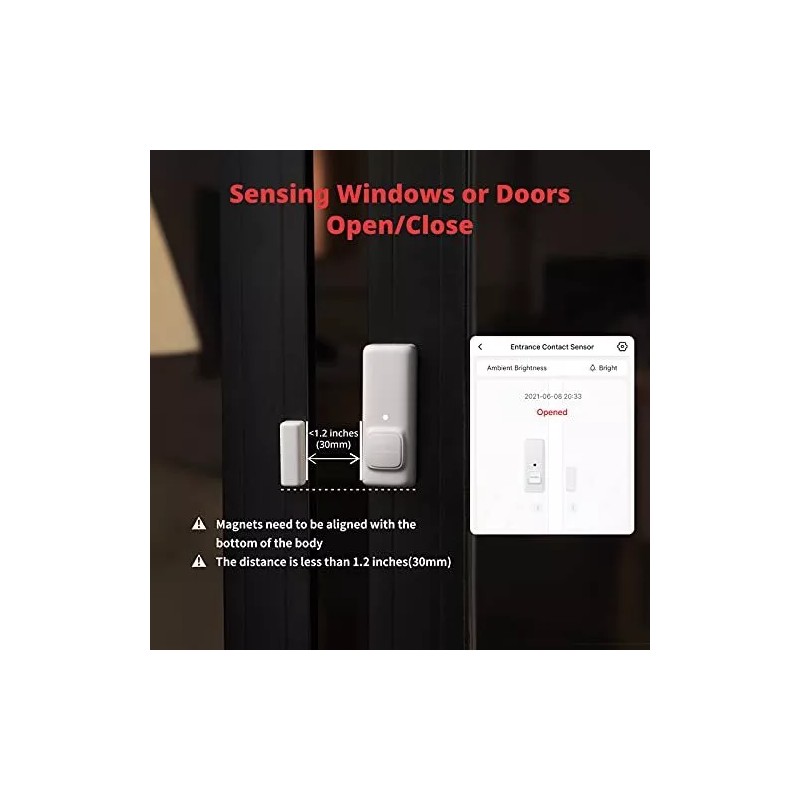 - [Window & Door Alarm Sensor for Home Security] SwitchBot Contact Sensor can detect the opening/closing of doors and windows, guarding security of the elderly, children, and pets. With the built-in light sensor, it will automatically trigger the Switchbot Bot to turn on the light when someone moves when the environment goes dark. The magnets need to be aligned with the bottom of the body, and the distance between the two components needs to be less than 1.2 inches (30mm).