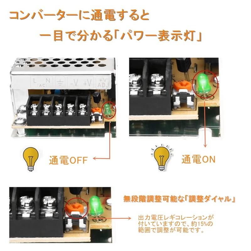 - Note: The output voltage can be adjusted with ADJ adjustment, but please do not touch the ADJ adjustment screw unless necessary. If you use a short circuit during high output settings, the wiring will melt and be dangerous