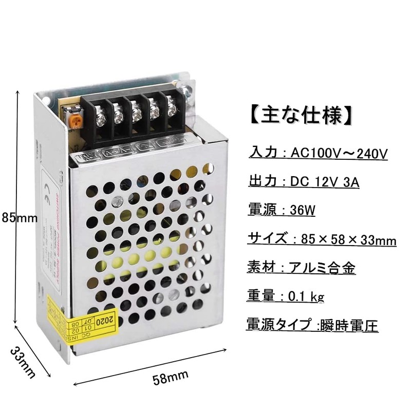 - Model Number: S-36-12 Conversion: AC100V to DC12 Case Material: Aluminum alloy (vented for automatic cooling) Main Color: Silver Set Includes: 12v 3a Switching Power Supply x 1 This product is for the main unit only. Wiring, etc. are not included. Please acknowledge