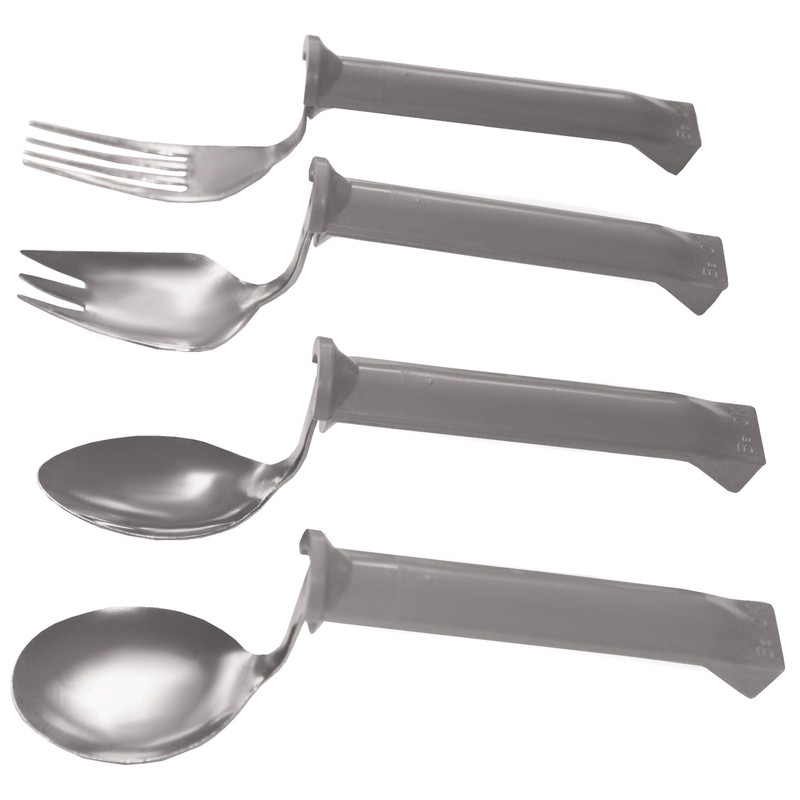 - This set of swivel utensils includes 1 fork, 1 soupspoon, 1 spork, and 1 teaspoon; these utensils are made of durable stainless steel and attached to lightweight plastic gray handles