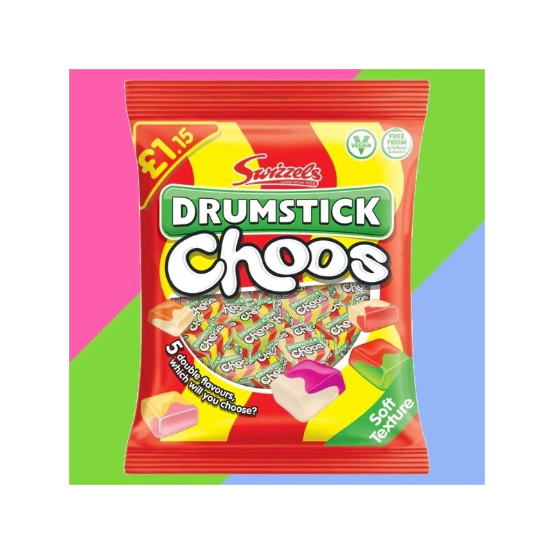 Inspired by the ever-popular Drumstick lollies by Swizzles, these Drumstick Choos are individually wrapped chew sweets in a mix of Drumstick flavors. 5 delicious dual flavors in each chew, these sweets are packed in a generous 115g bag, perfect for sharing.