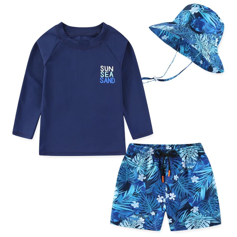 Rashguard — Environmental protection sunscreen material, block UV skin is not harmed. Swim Trunks — Features pull-on gentle elasticized waistband with functional drawstring and mesh lining for easy on/off, side vents at hem and allover print. Sun Hat — The baby sun hat is equipped with high-quality UPF 50+ sun protection polyester and a wide brim, skin-friendly and comfortable, keeping your lovely baby cool, dry and ventilated in bright sunshine. The head strap and chin strap on the baby boy hats are adjustable to easily create the best fit possible, showing off their nifty and lovely while providing comfort. Baby Boy Swimsuit Rash Guard Features High quality and UPF 50+ fabric protection against UVA/UVB rays to prevent sunburn. Rashguard:87% polyester,13% spandex; Swim trunks & Sun Hat :100% polyester; lining made of 100% polyester mesh. Care instructions:Machine Wash Closure type:Pull On