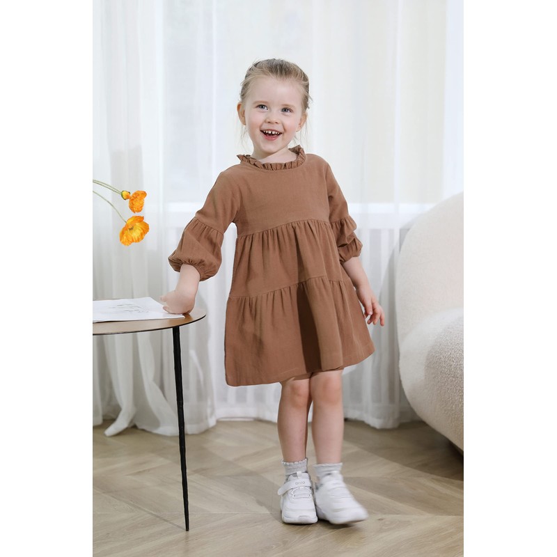 SWNONE Toddler Kids Baby Girl Dress Lantern Long Sleeve Solid Color Casual Dresses Girls Fall Winter Outfit Clothes (5-6X, Khaki)