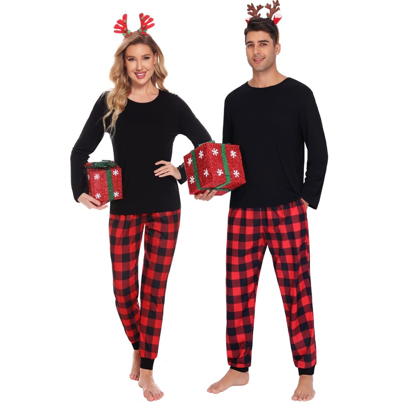 SWOMOG Christmas Pajamas for Women Men Long Sleeve Black Pull Over Top with Plaid Pajama Pants Pj Set Couples Pajama Set