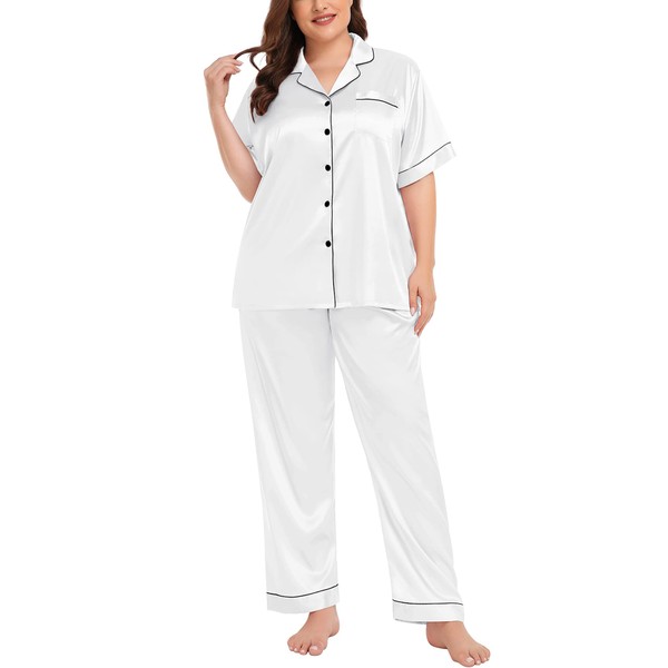 SWOMOG Plus Size Silk Pjs for Women Satin Pajamas Bridal Pajama Set V-Neck Classic Pj Set for Pajama Party 2 Piece Loungewear 18W White