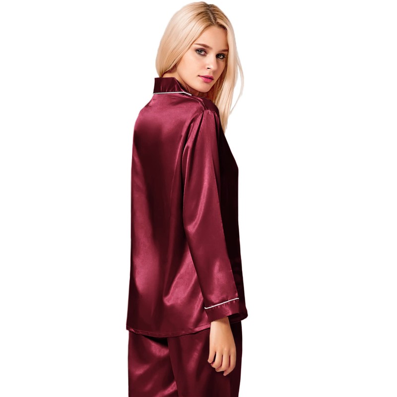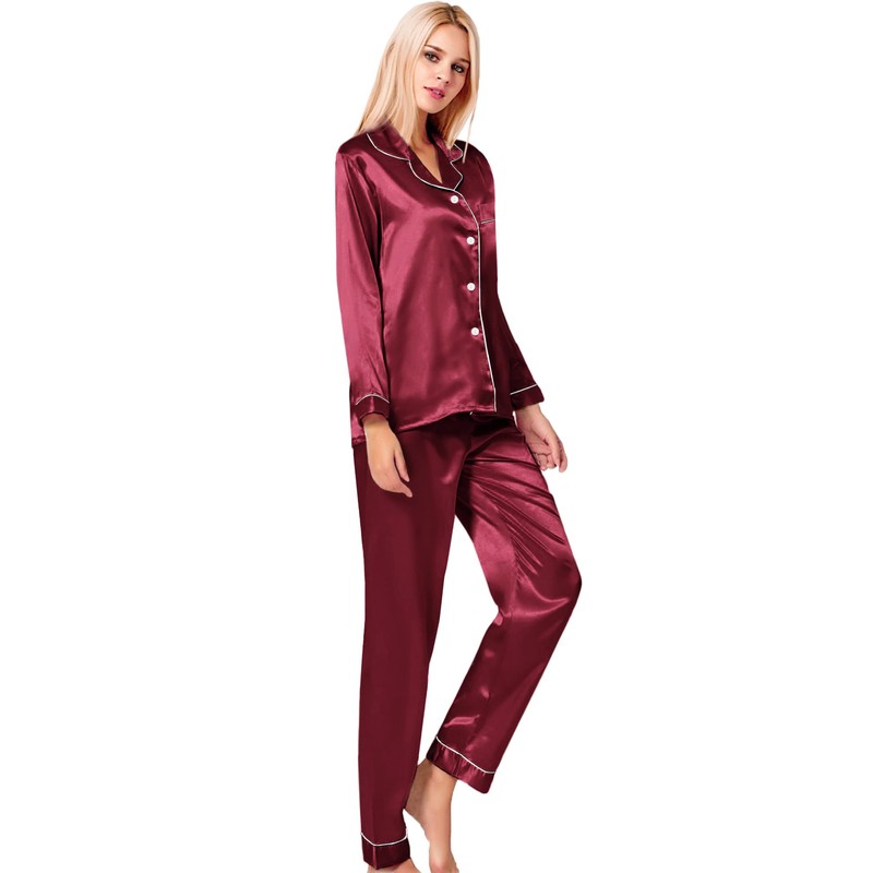 SWOMOG Satin Women's Pyjamas with Button Placket, Long Sleeve Sleepwear, Pyjamas Set, Two Piece Sleepwear Leisure Suit, darkred