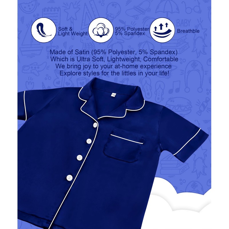 - 【Featured Designs】 - Classic 3-Pieces Kid's Satin Pyjama Set includes: Short-Sleeve Sleepshirt, Pair of Shorts and Pair of Long Pants. Button-Down Pyjama Set with Short-Sleeve Top and Elastic Waist Pants makes your Kid's body feel relaxed. Top features Classic Notch Collar, Chest Pocket lending sophisticated detail. Pants with Elastic Waist, Loose Fit with Superior Stitching, Contrast Piping Along Hem. and chest