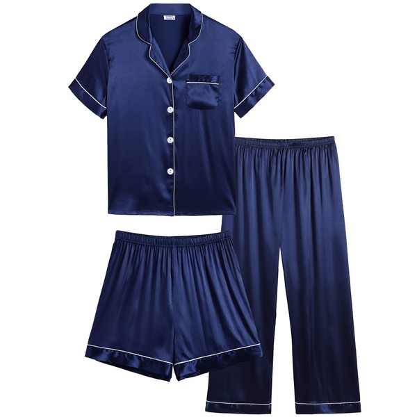 SWOMOG Toddler Girls Boys 3pcs Silk Satin Pyjamas Set Baby Button-Down PJs Sets Loungewear Short Sleeve Sleepwear with Short Pants Navy Blue