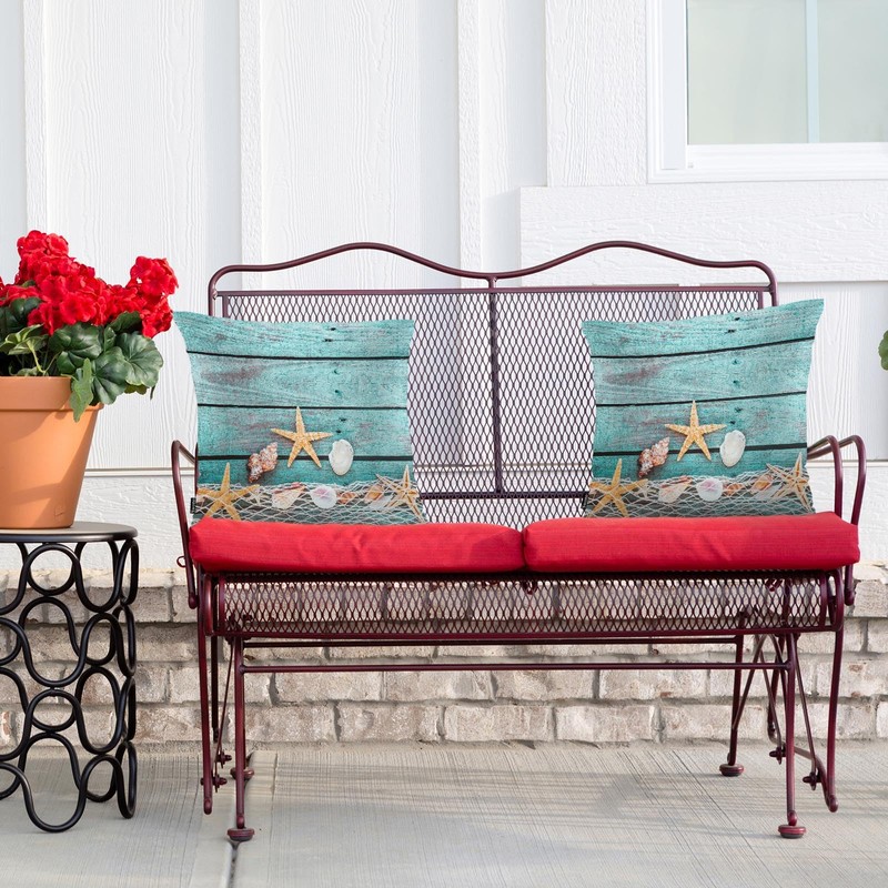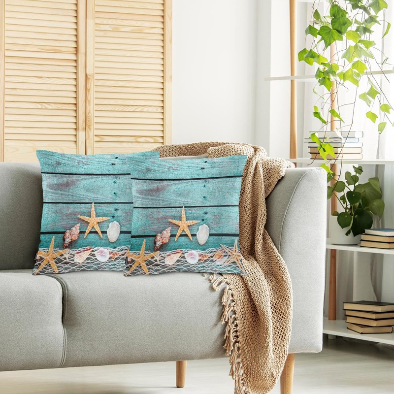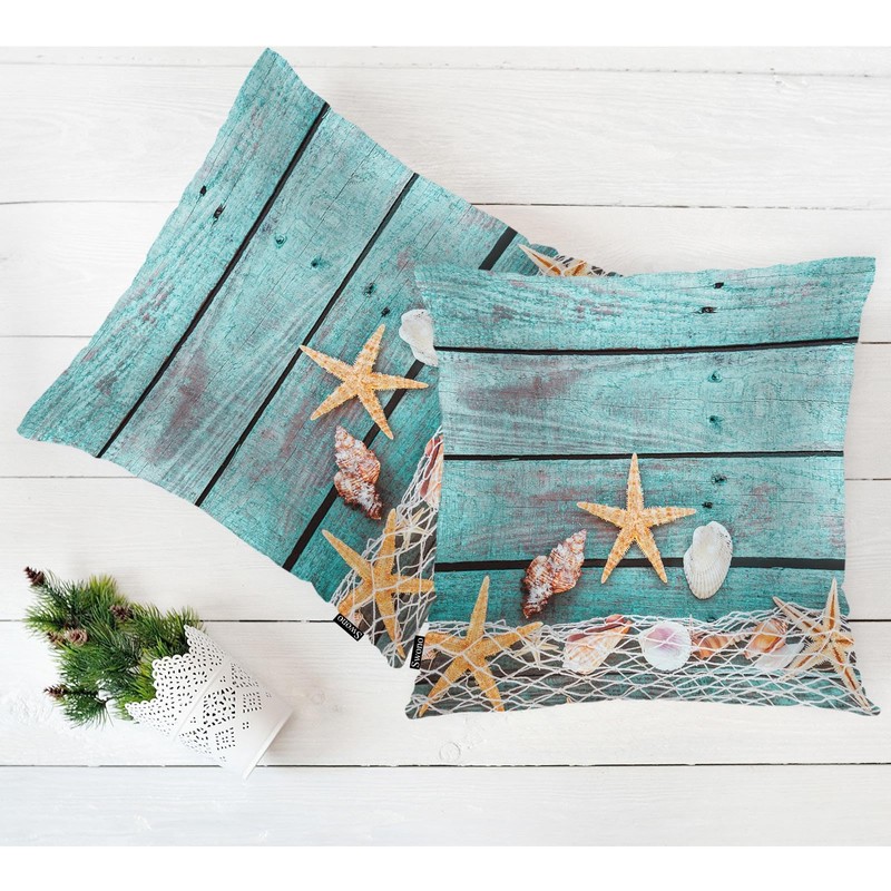 Swono Marine Throw Pillow Cases, Fishing Net Seashells Starfish Set of 2 Decorative Throw Pillow Cover Turquoise Blue Wood Square Pillow Cushion Case Home Decor for Sofa Couch Bed Car 18x18 Inch
