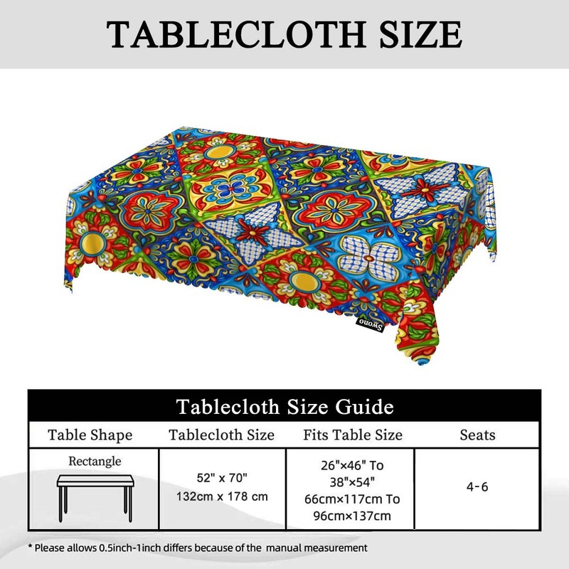- 1.TABLECLOTH SIZE - Mexican Pattern Tablecloth measures 52" Width x 70" Length (130 x 180 cm). Fits tables that seat 4-6 people. please measure your table size before buying