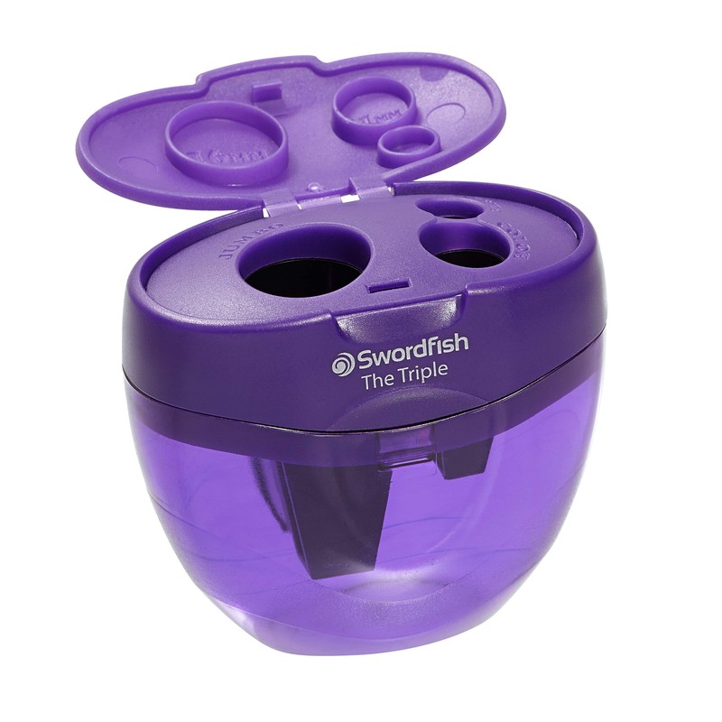 The Swordfish 40228 ‘The Triple’ 3 Hole Purple Sharpeners are ideal for standard 8mm pencils, jumbo 11mm pencils and 16mm crayons up to 16mm in diameter.