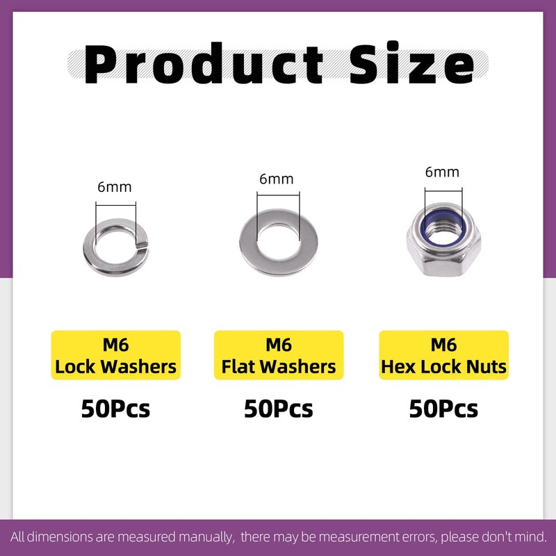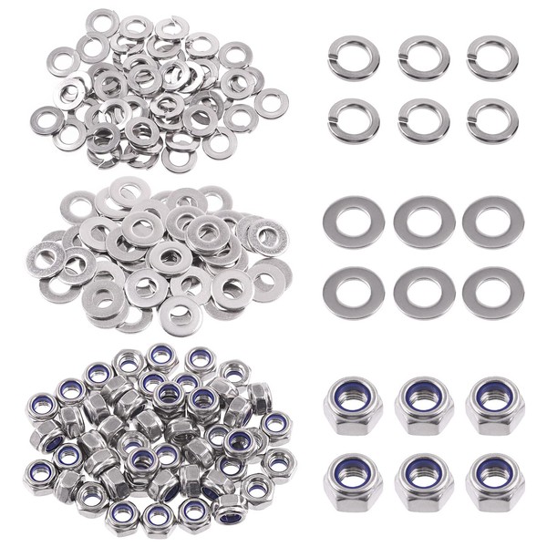 - 💯 What You Get ------ In this kit, You will get 150Pcs Metric 304 Stainless Steel M6 Hex Lock Nuts and M6 Flat Washers with M6 Split Lock Washers Assortment Kit, Including 50Pcs Hex Lock Nuts; 50Pcs Flat Washers; 50Pcs Split Lock Washers. Intotal 150Pcs can meet all your needs. PS: Individual size products do not have boxes, only sets have boxes.
