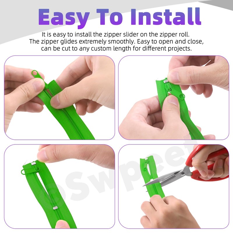 Sewing zips are made of high-quality nylon and plastics, the zip head is made of sturdy metal, through dyeing, cutting and other processes, will not fade or break, the material is lightweight and wear-resistant, durable.