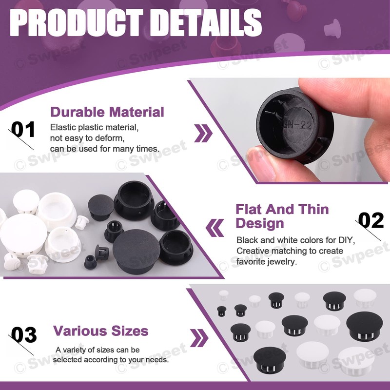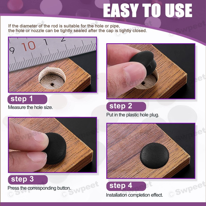 💥 Plastic hole cover caps are fixed with vertical strips, the card teeth elastic clip design, once pressed, not easy to fall off. Just choose right size plug according to the hole plug diameter and press it into the hole, no tools required.