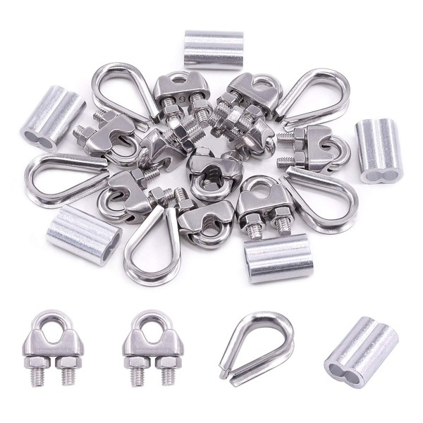 Swpeet 24Pcs M6 (1/4") Wire Rope Accessory Set, Included M6 Wire Rope Cable Clip Clamp, M6 Stainless Steel Thimble, 6mm Aluminum Crimping Loop Sleeve Perfect for 1/8 inch Wire Rope Cable (M6)