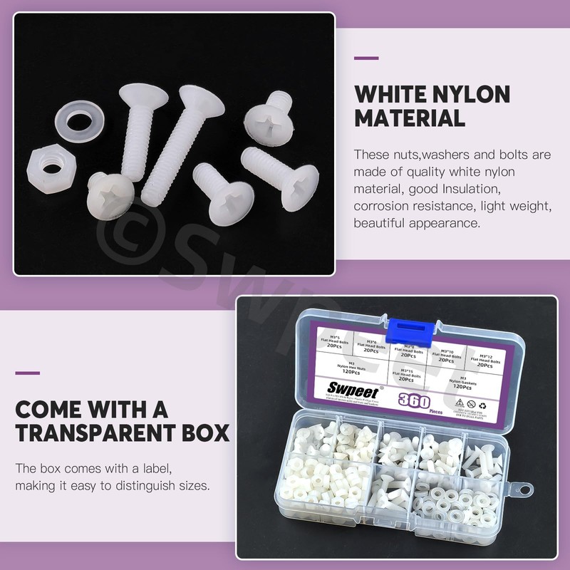 - 🥇 What You Get: In this kit, you will get 360Pcs 6 Sizes M3 White Nylon Phillips Cross Flat Head Screws with Nuts and Gaskets. Including 6 sizes nylon screw M3×5: 20Pcs; M3×6: 20Pcs; M3×8: 20Pcs; M3×10: 20Pcs; M3×12: 20Pcs; M3×15: 20Pcs; and M3 nuts: 120Pcs; gaskets washers: 120Pcs. A total of 360Pcs nylon screws and nuts to meet your daily demands.