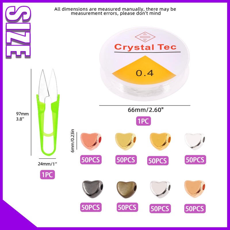 - What you get: you will receive 402 pieces heart beads jewellery making set, including 400 pieces heart beads in 8 colours, such as gold, silver, bronze, black and so on. Each colour with 50 pieces, total 400 pieces. The heart beads sizes 7 x 6 mm / 0.3 x 0.2 inches. With a roll of elastic cord and scissors to meet your needs.
