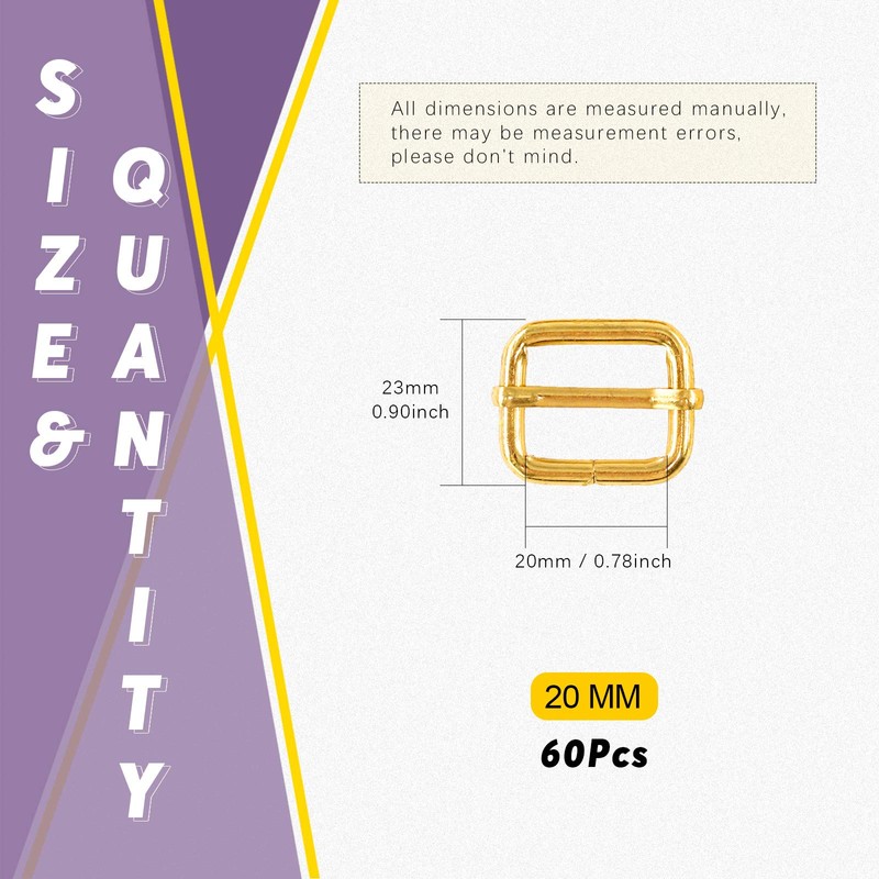 Swpeet 60Pcs 3/4 Inch - 20mm Gold Metal Rings Metal Rectangle Adjuster Triglides Slides Buckle, Roller Pin Buckles Slider Strap Adjuster Keychains for Belt Bags DIY(Gold, 3/4 Inch)