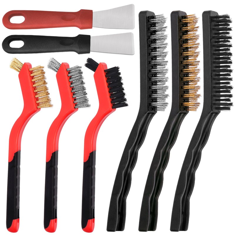 - 📿 【Wide Application】------ 9" wire brushes set suitable for easily cleaning large surface while 7" for small spaces and narrow corners,like Stoves,Grill etc. These small cleaning brushes are suitable for different surface types, they will address all your cleaning concerns.The metal scraper is a perfect choice to be as kitchen grease cleaning spatula, griddle scraper and food scraper tool.The tough scraper can be used in kitchens, food shops, outdoor camping barbecues.