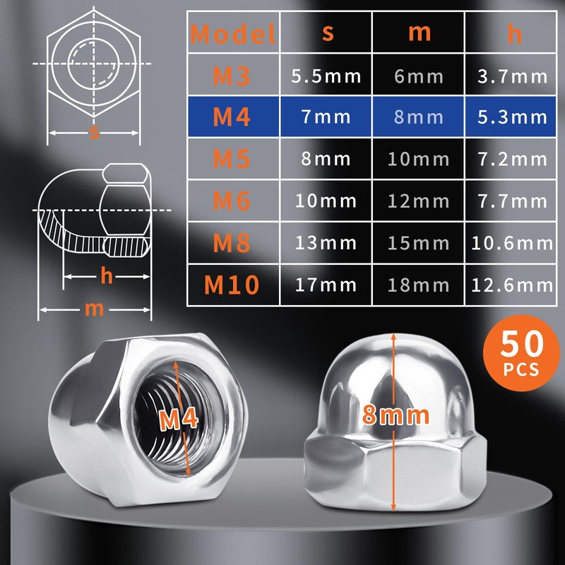 - Package Contents: You will receive 50pcs SWTYExt stainless steel cap nuts M4 that meet the DIN1587 metric standard. These nuts come in sufficient quantity for various applications, providing reliable solutions for securing metal parts, wooden products, and outdoor structures.