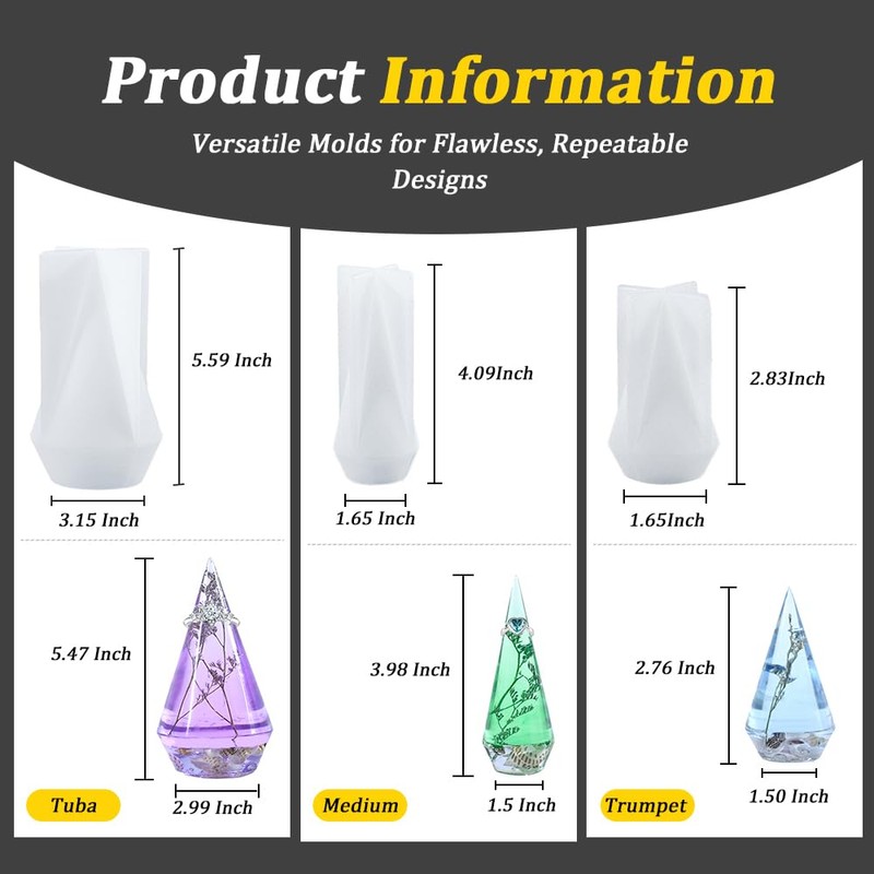 - 【Package】:3.15*5.59 inchs,1.65*4.09 inchs,1.65*2.83 inchs,3 pcs Cone Silicone Molds