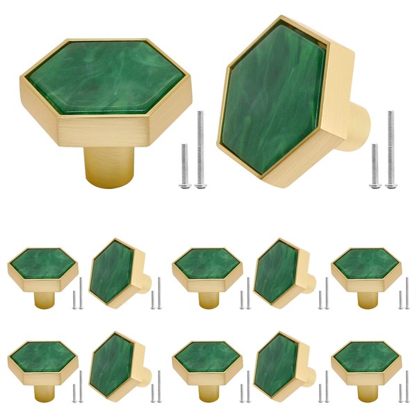 SWZHAI 12 Pcs Gold Knobs for Dresser Drawers, Brushed Brass Hexagon Knobs Drawer Knobs, 1-1/4" Gold Cabinet Knobs Dresser Knobs Pulls for Kitchen Cabinets Cupboard Furniture Knobs, Green