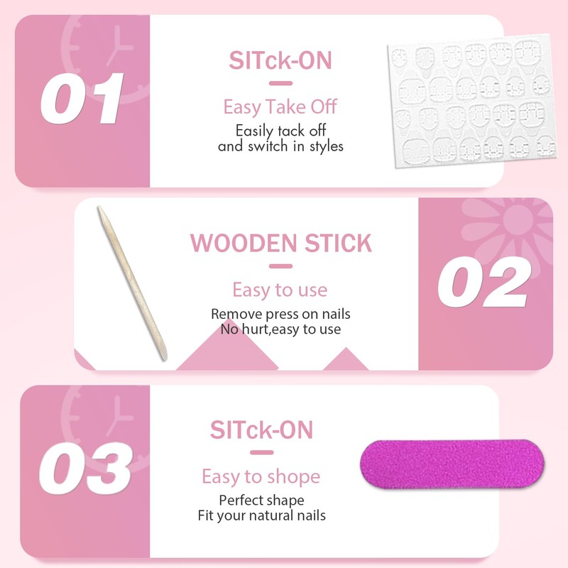2.Please note that the nail glue is not included.If you want it last for a longer time,please use nail glue instead of the nail stickers.