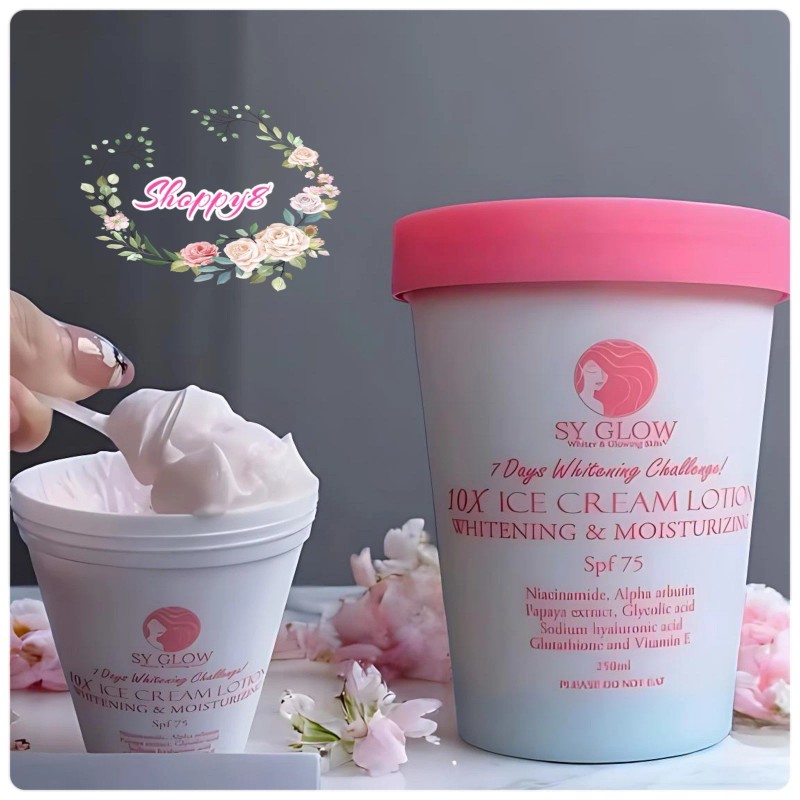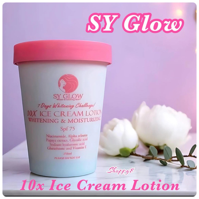 SY GLOW 10X Ice Cream Lotion is a body whitening and moisturizing lotion with SPF70. It offers benefits like hydrating dry skin, softening and soothing rough skin, maintaining healthy skin, minimizing aging signs, and providing a pleasant scent. The lotion is formulated to rehydrate dry skin, making it feel softer and smoother.