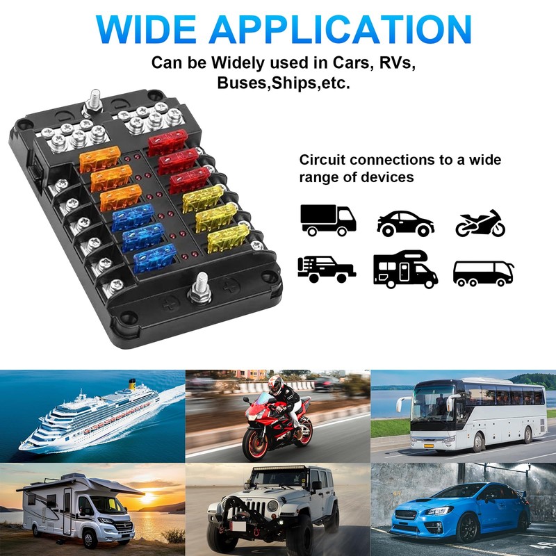 - Wide range of applications: the input voltage of this 12-fold car fuse box is 8-32 V, which is widely used in DC 12/24V cars, caravans, trucks, vans, SUVs, buses, boats and so on. It is used to control the electrical equipment of the vehicle, such as lights, cooker hood, air conditioning and so on