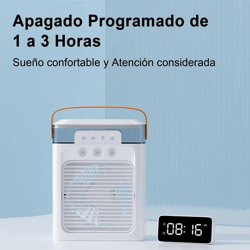 - VENTLLADOR MULTIFUNCION 3 EN 1: Es un ventilador, un humidificador y una luz nocturna. La humedad del rociado se puede ajustar y se puede controlar cuántas boquillas se pueden encender al mismo tiempo. Se pueden ajustar las luces en 7 colores. Se puede apagar automáticamente a una hora programada de 1 a 3 horas para evitar resfriados causados por el soplado prolongado.Se pueden agregar cubitos de hielo al depósito de agua superior para bajar la temperatura más rápido.