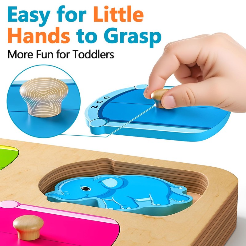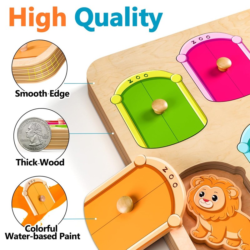 - Color Matching & Develop Skills: The colors of puzzles match the animals, and children can improve their color recognition ability and recognize cute and vivid animals in color matching games time. With easy-grasp wooden knobs, babies and kids will delight in their ability to grasp, lift, and manipulate the pieces, which improve their fine motor skills.