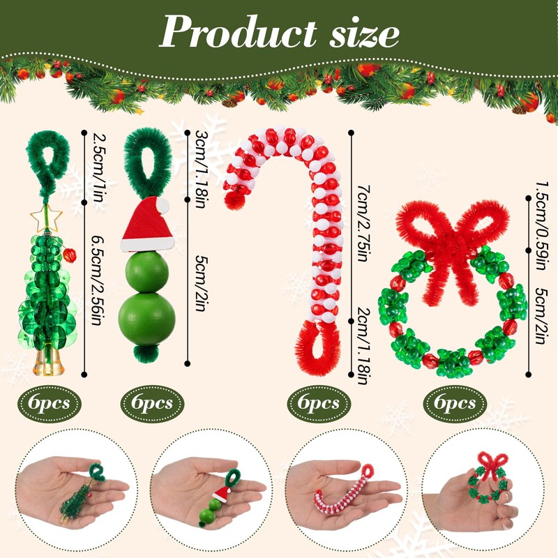 - Festive Creativity Bundle: unleash holiday creativity with our Christmas beaded ornaments kit, featuring materials to craft 24 ornaments; With options like 6 green monsters, 6 wreaths, 6 candy canes, and 6 Christmas trees, every kit promises a delightful crafting experience