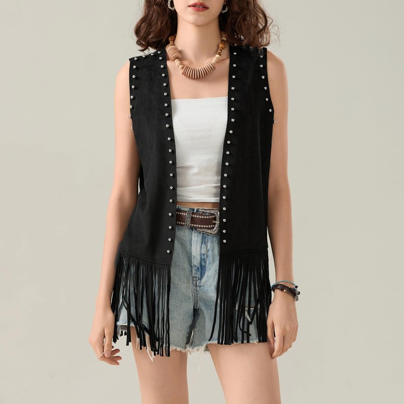 Women's Tassel Sleeveless Vest Rivet Open Front Sleeveless Long Jacket Hippie