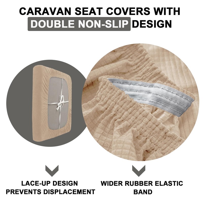 - WATERPROOF CARAVAN SEAT COVERS: The latest hot melt adhesive lamination technology and water repellent treatment process, the lamination coating on the back, ensure a 100% water repellent and leak-proof effect as well as excellent elasticity and stretchability, protect the cushions from most stains and liquids, ideal for your RV work.