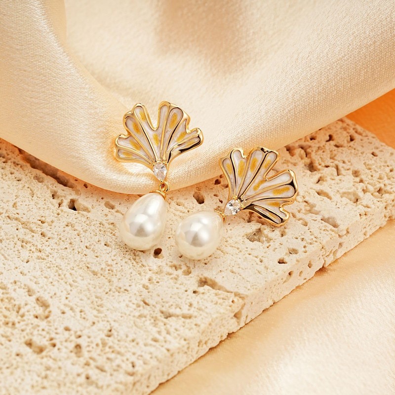 Sylph Pearl Drop Earring for Women Dangle Statement Earrings Faux Pearl Apricot Leaf Earrings Enamel CZ Stud Earring Bridal Wedding