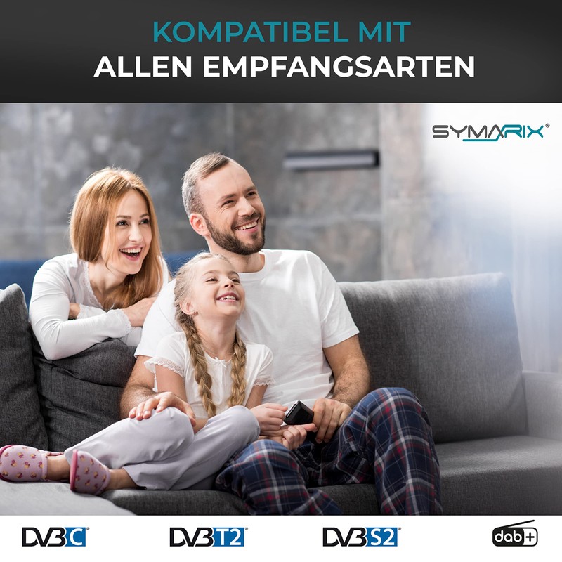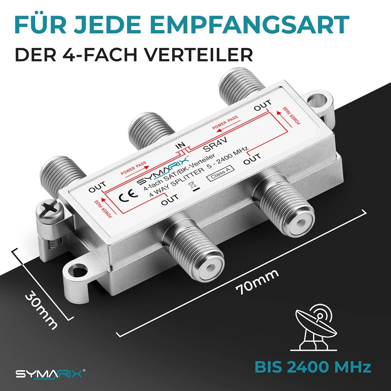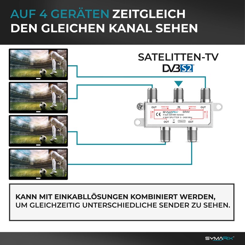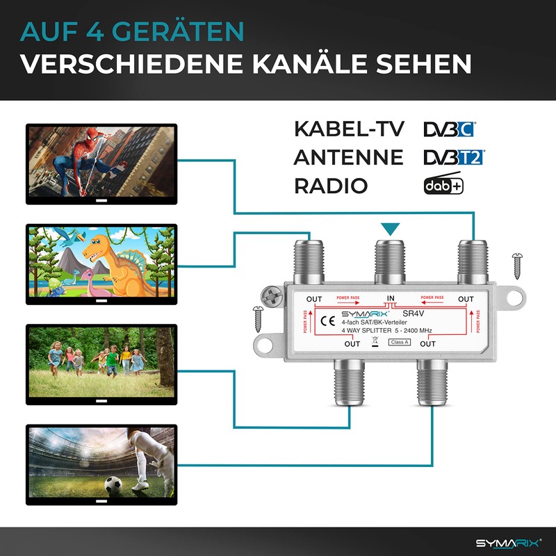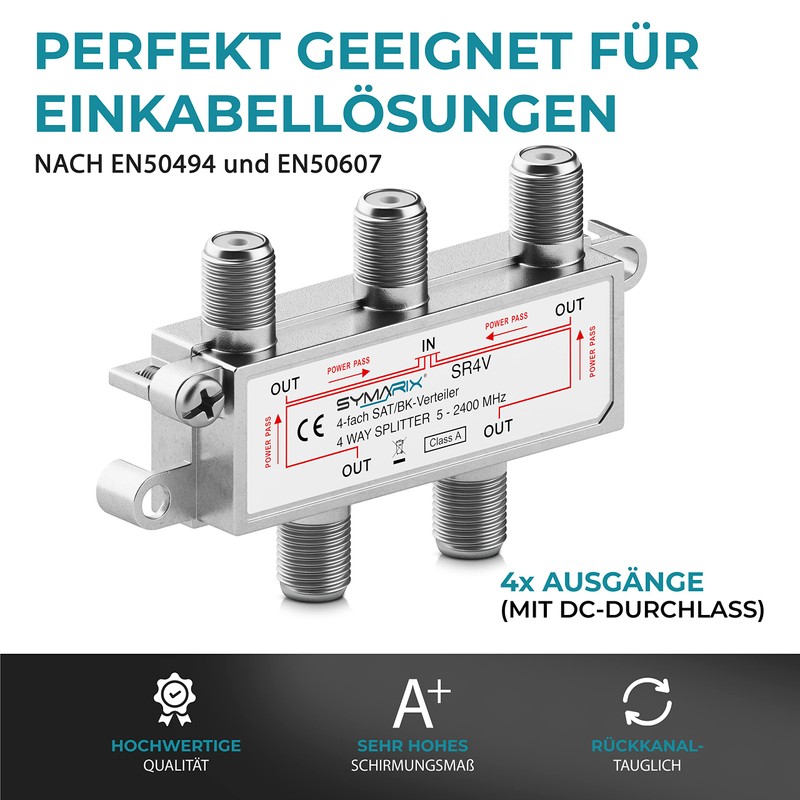 SYMARIX SR4V SAT & BK - 4-Way Splitter with DC Passage - UHD - Single Cable / SCR / Unicable Suitable - Splitter / Switch - for - DVB-S2 - BK - DVB-T2 - FM/DAB - Fully Shielded Shielding Rate ≥ 110 dB