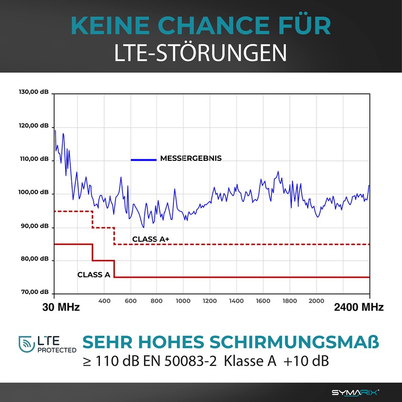 - Very high shielding rate (≥ 110 dB) EN 50083-2 class A +10 dB exceeding - LTE interference has no chance