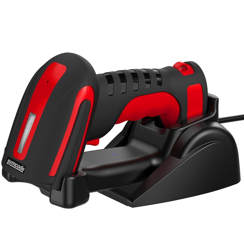 Symcode 2D Industrial Barcode Scanner with Stand 433 Wireless 1968 Feet Transmission Distance USB QR Automatic Barcode Reader Handhold Hands-Free Bar Code Scanner with Charging Base Red