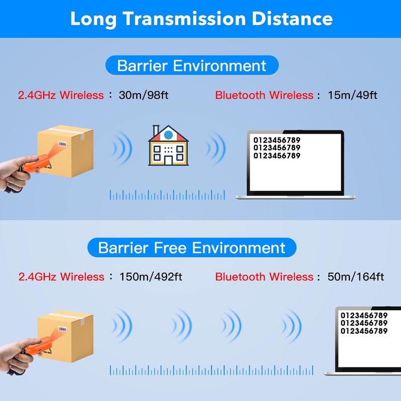 - ✅3-in-1 Connection Design: Convenient to switch between 2.4G wireless & Bluetooth & USB wired three types of connection mode, plug and play, needn't any drivers. Scanner delivers up to 150m/492ft transmission distance in barrier free under the 2.4G wireless mode, up to 50m/164ft transmission distance barrier free under the Bluetooth mode.
