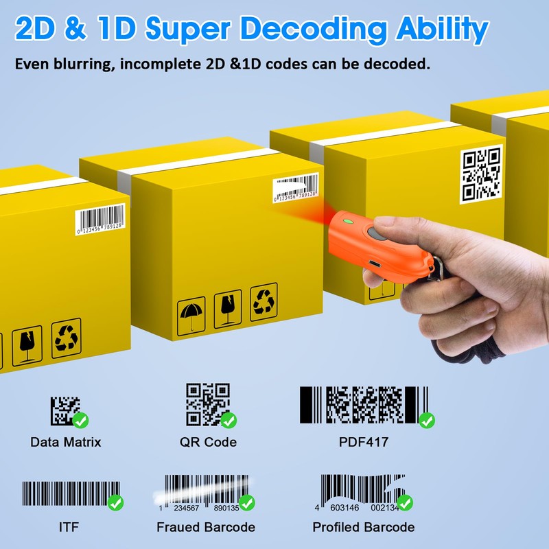 - ✅Super Decoding Ability: Easily capture all common bar codes (2D and 1D) on labels as well as on mobile phone displays. Even blurring, incomplete barcodes can be decoded and uploaded at superfast speeds. 2D: QR Code、 Data Matrix、PDF417、Aztec code、Maxicode. 1D:JAN/EAN-13、JAN/EAN-8、UPC-A、UPC-E、Code11、Code32、Code39、Code 39 Full ASCII、Code93、Code128、Codabar(NW-7)、Interleaved 2 of 5 、Matrix 2 of 5、Industrial 2 of 5、Standard 2 of 5、PLESSEY、MSI、ITF14、ISBN、ISSN、GS1 Databar、GS1-128 (UCC/EAN128)、ISBT-128.