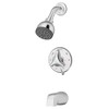 - Polished chrome tub and shower trim kit includes showerhead, shower arm, escutcheon, handles, valve, and tub spout