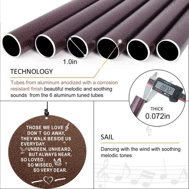 - This metal sympathy wind chime is durable, waterproof and wear-resistant, The wood parts are made from premium pinewood. The tubes on our all memorial wind chimes are made from an aluminum alloy that's powder coated with Black finish with copper vein, they are corrosion-resistant and thickened, well-tuned, so it can produces comforting smoothing deep tones. Big pipe size- 15.5 Inch