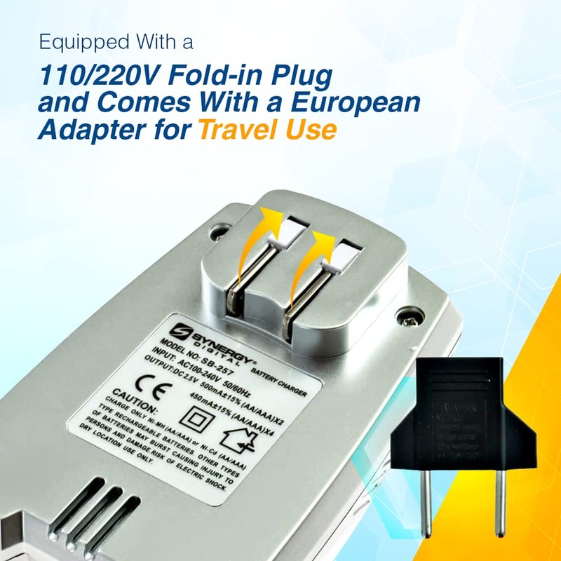 - Portable Design: Due to its small size and 110-220 VAC voltage adjustment, Synergy Digital’s Quick Battery Charger is perfect for home and worldwide travel use. In addition to a convenient flip-out AC plug, it also comes with a European adapter.