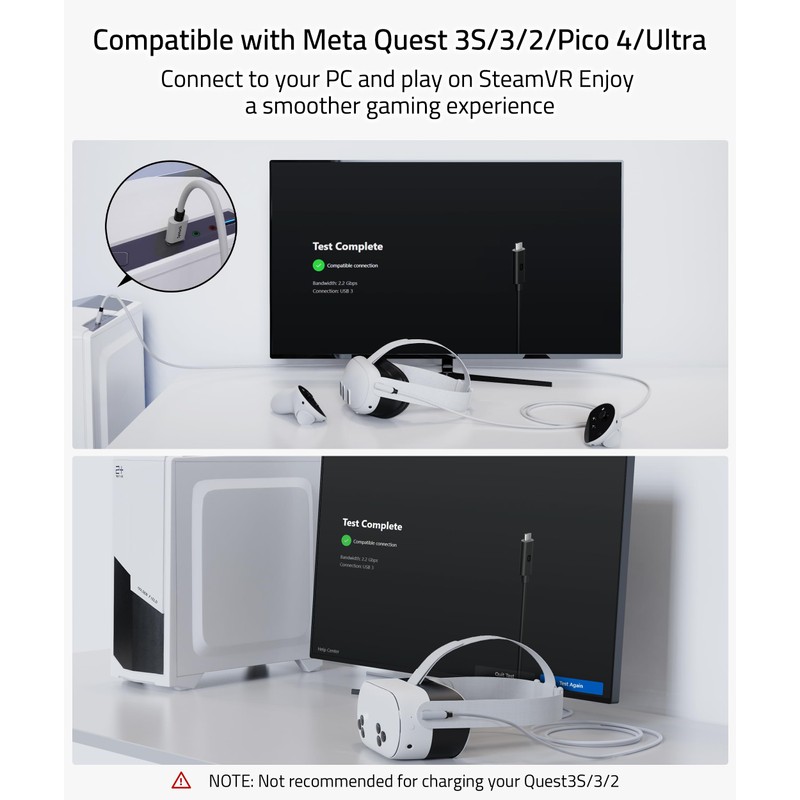 - Super Cost-effective: Syntech Link Cable combining the two advantages of length and excellent connection performance will make you feel good value for money. As a reminder, the charging current will decrease as the cable length increases, so we do not recommend using this cable to charge your Quest3/Quest2/Pro/Pico4. Additionally, to enhance your VR experience, we do not recommend using this cable when the headset is at a low battery level.