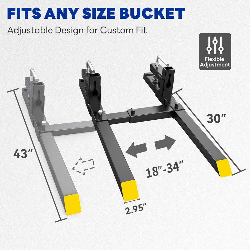 - 18"-34" Adjustable Stabilizer Bar: Customize spacing for tractor forks using the stabilizer bar, which balances weight distribution for logs, pallets, or uneven loads. Reinforced crossbars handle lateral forces and prevent fork separation during heavy lifting.