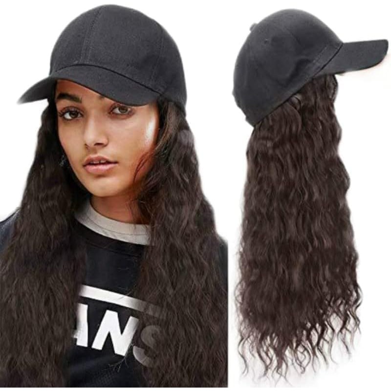 Enhance your style with these wavy extensions, seamlessly integrated into a trendy cap.