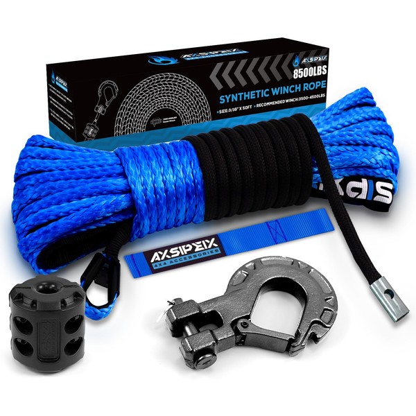 Synthetic Winch Rope Kit, 3/16" x 50ft 8500LBS Blue Winch Cable with Protective Sleeve, Forged Winch Hook, Rubber Stopper and Safety Pull Strap for ATV UTV