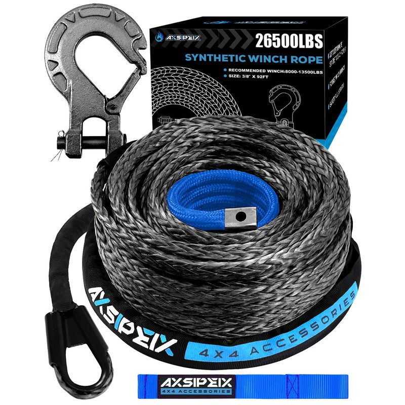 - Heavy-Duty Winch Rope Kit: This kit offers reliable performance for off-road adventures; The 3/8" x 85ft synthetic rope has a 26,500 Lbs break strength; The 3/8" forged hook handles up to 38500lbs; The pull strap adds convenience and safety; This kit is a valuable addition to your gear
