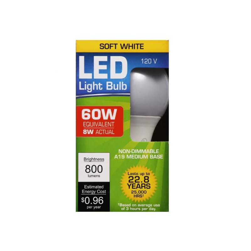 Light up your life for less! These warm-white energy saving LED bulbs give off as much light as an incandescent 60-Watt bulb while only using 8-watts of energy. Plus, they last up to 22 years! The A-19 bulb base fits standard-sized fixtures and are suitable for enclosed light fixtures. A must have for offices, homes, rental properties, hotels, restaurants, and more.